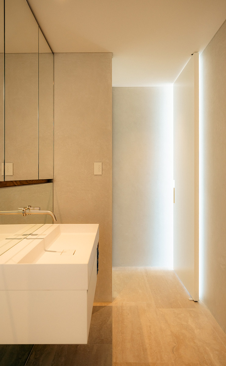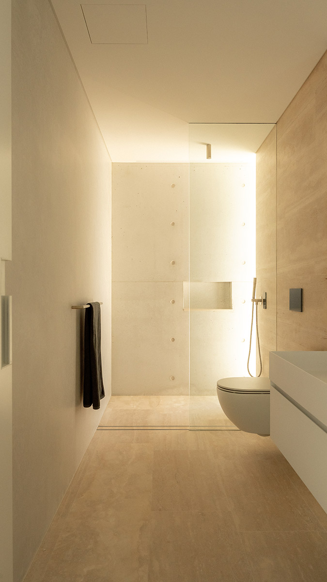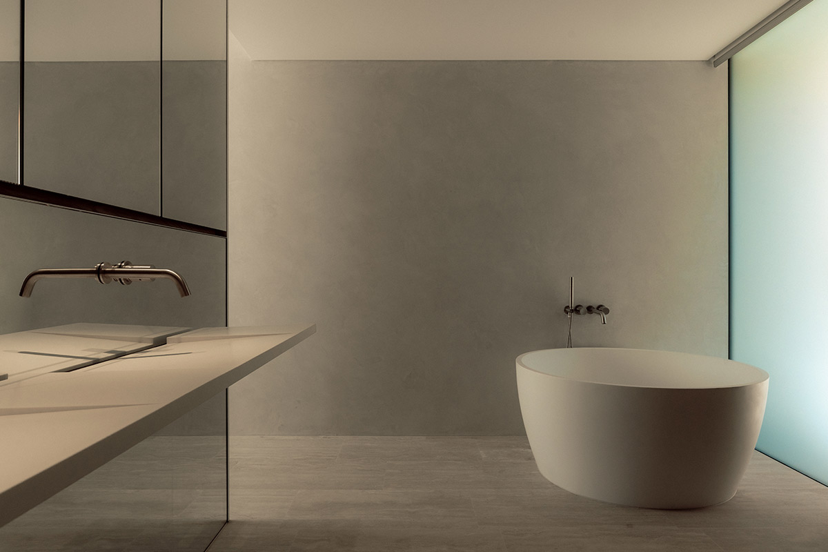 Tony Tomizzi Builders have brought together a harmonious palette of Tivoli travertine, polished plaster, and white formed concrete, creating an aesthetic that reads as both sculptural and serene. Every surface feels intentional; every detail, seamlessly resolved.