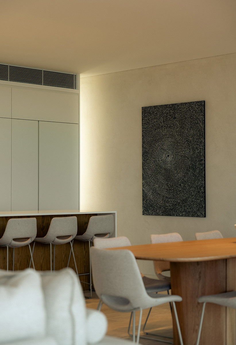 Completing the experience are the hand-selected Italian stone benchtops, their natural veining adding a bespoke richness to the home’s cool, contemporary palette.